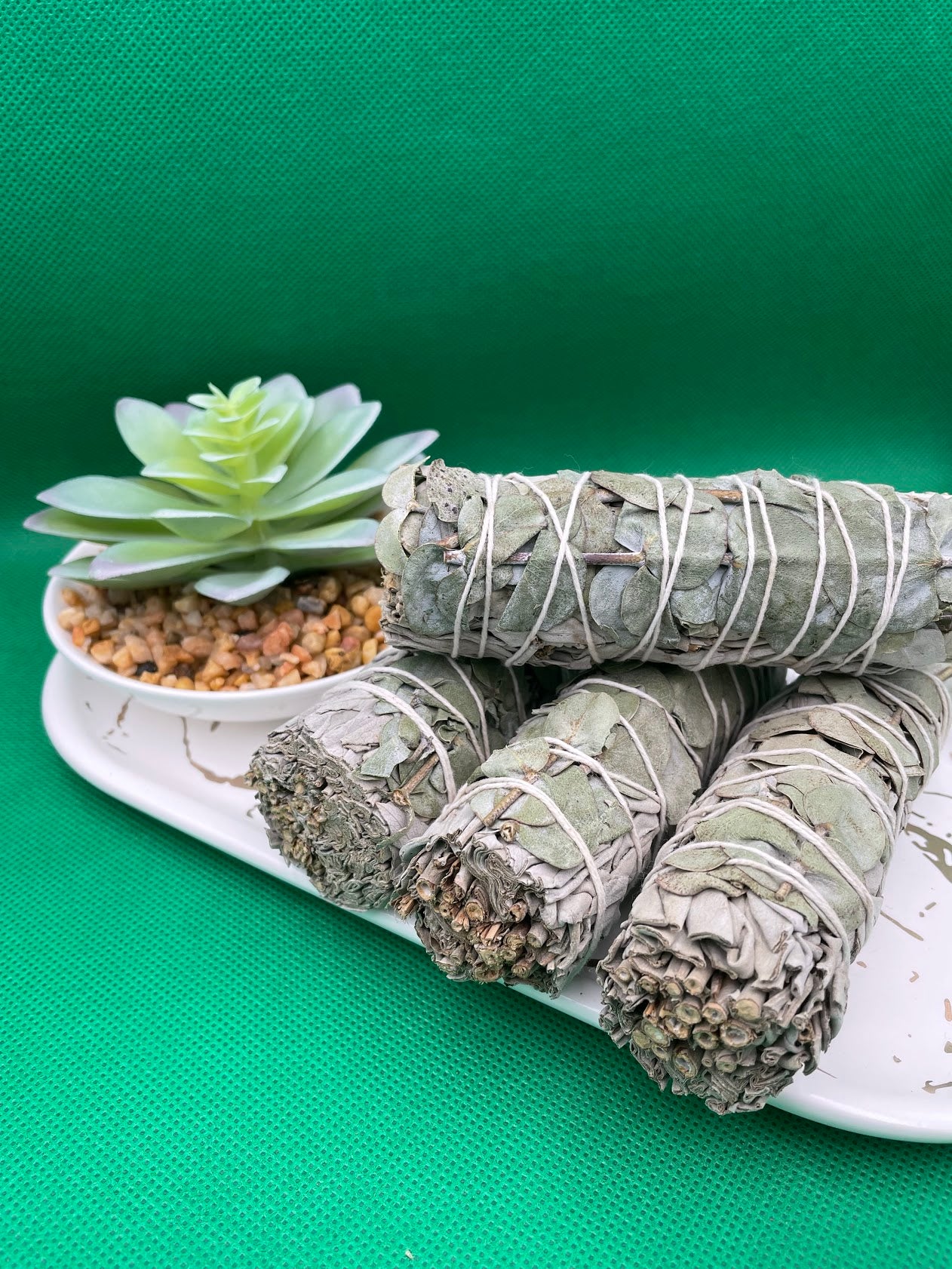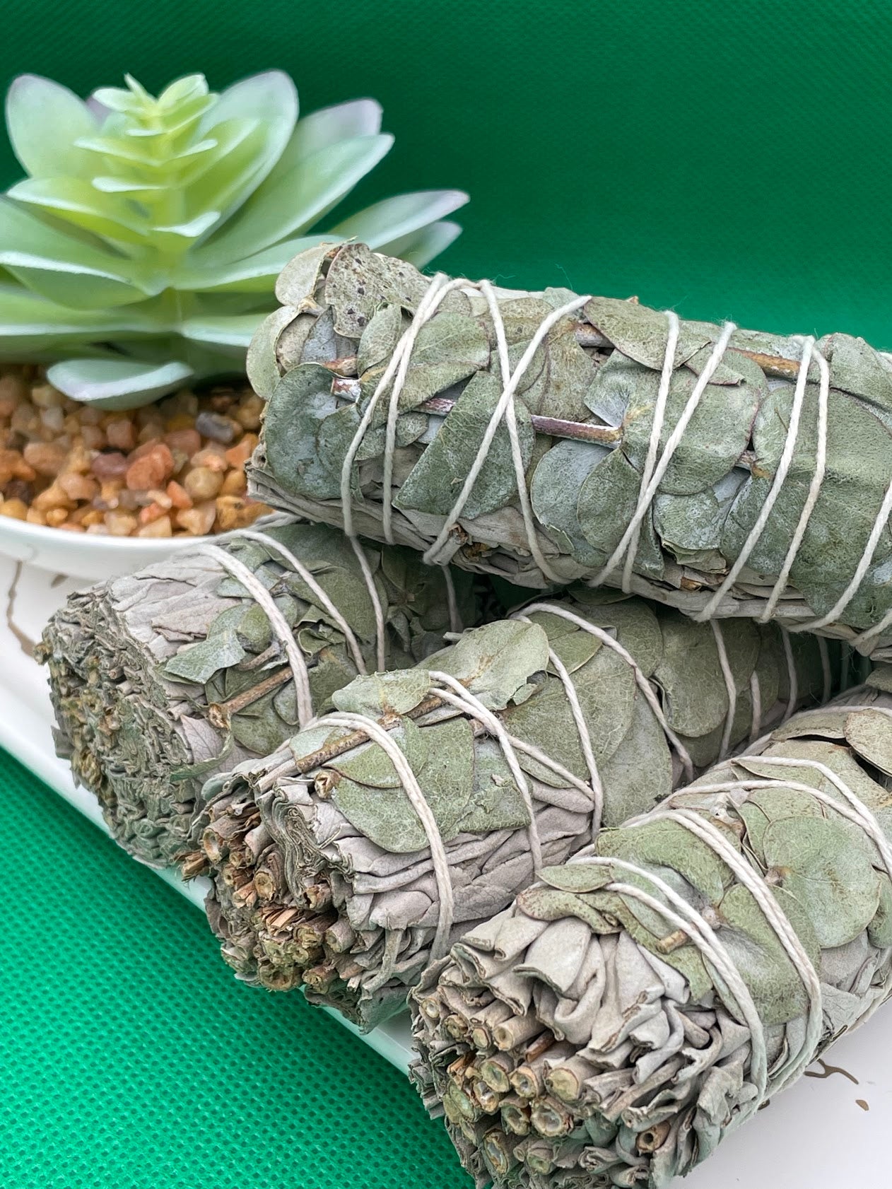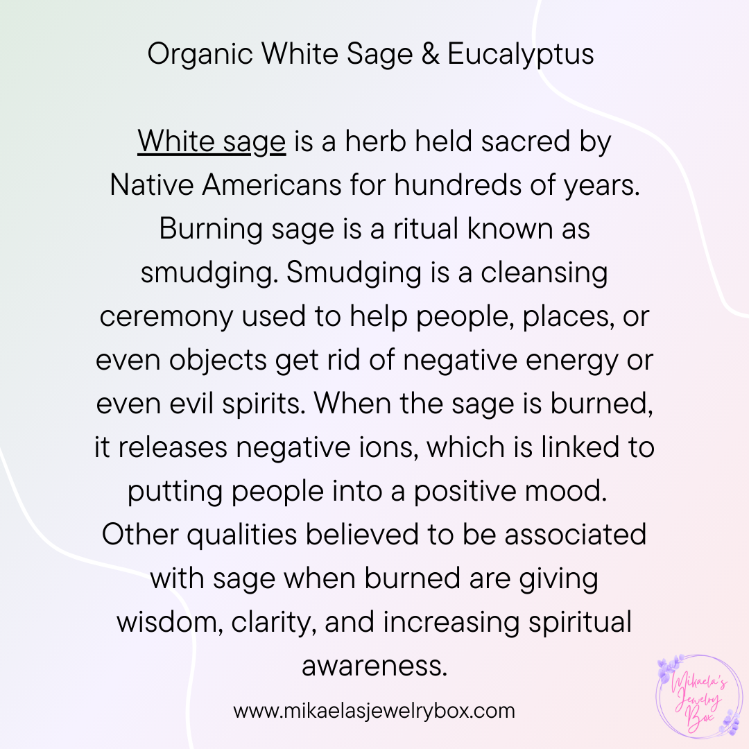Organic White Sage mixed with Eucalyptus leaves used for smudging. The main way to cleanse crystals using sage is by a method called “smudging” which means using smoke from smoldering dried sage leaves in and around the energetic field surrounding your crystal. This smoke is used to cleanse negative energy from an object, space or person.